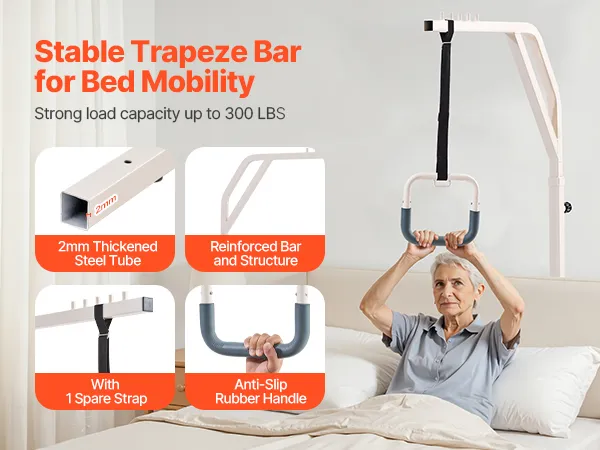 Flexible Anpassung: Die Gesamthöhe dieses Bettgalgens ist verstellbar. Dank des verstellbaren Gurtes können Sie sowohl die Trapezhöhe als auch die Griffhöhe nach Bedarf anpassen. Der Gurt lässt sich horizontal und in mehreren Positionen entlang des oberen Stützarms verstellen, was für mehr Flexibilität und Komfort sorgt