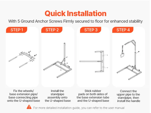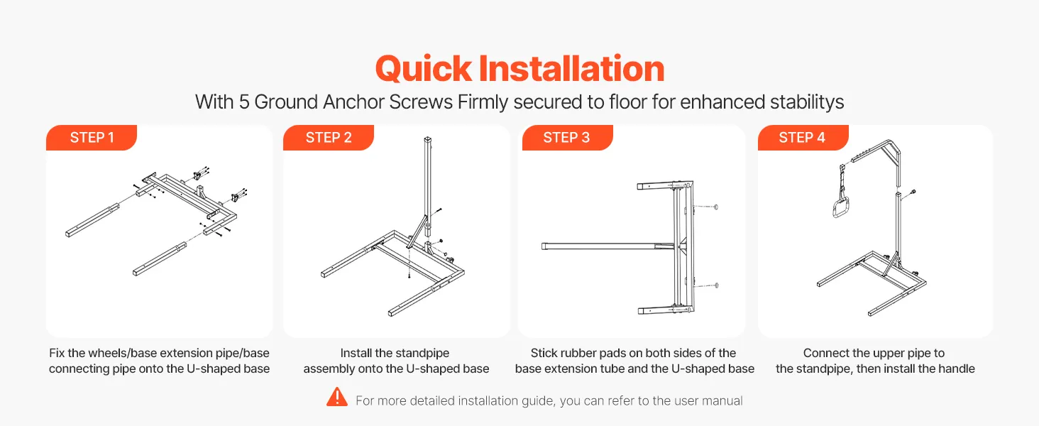 Robust und stabil: Dieser Krankenaufrichter besteht aus einem verstärkten, robusten Q195-Stahlrahmen und bietet eine hohe Tragfähigkeit von bis zu 136 kg. Die doppelstabverstärkte Struktur an der Basis und Oberseite erhöht die strukturelle Festigkeit, verhindert Wackeln oder Kippen und bietet Patienten stabile Unterstützung beim Aufstehen und Umpositionieren