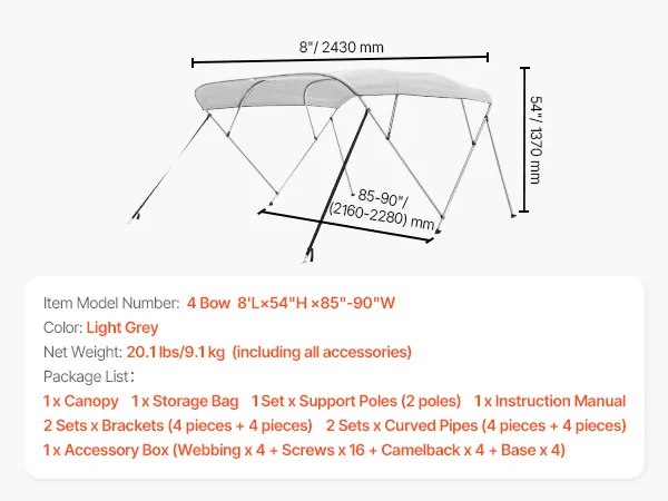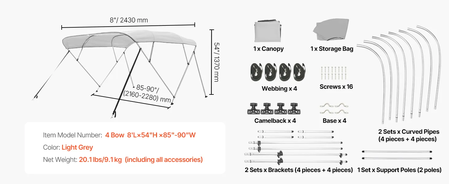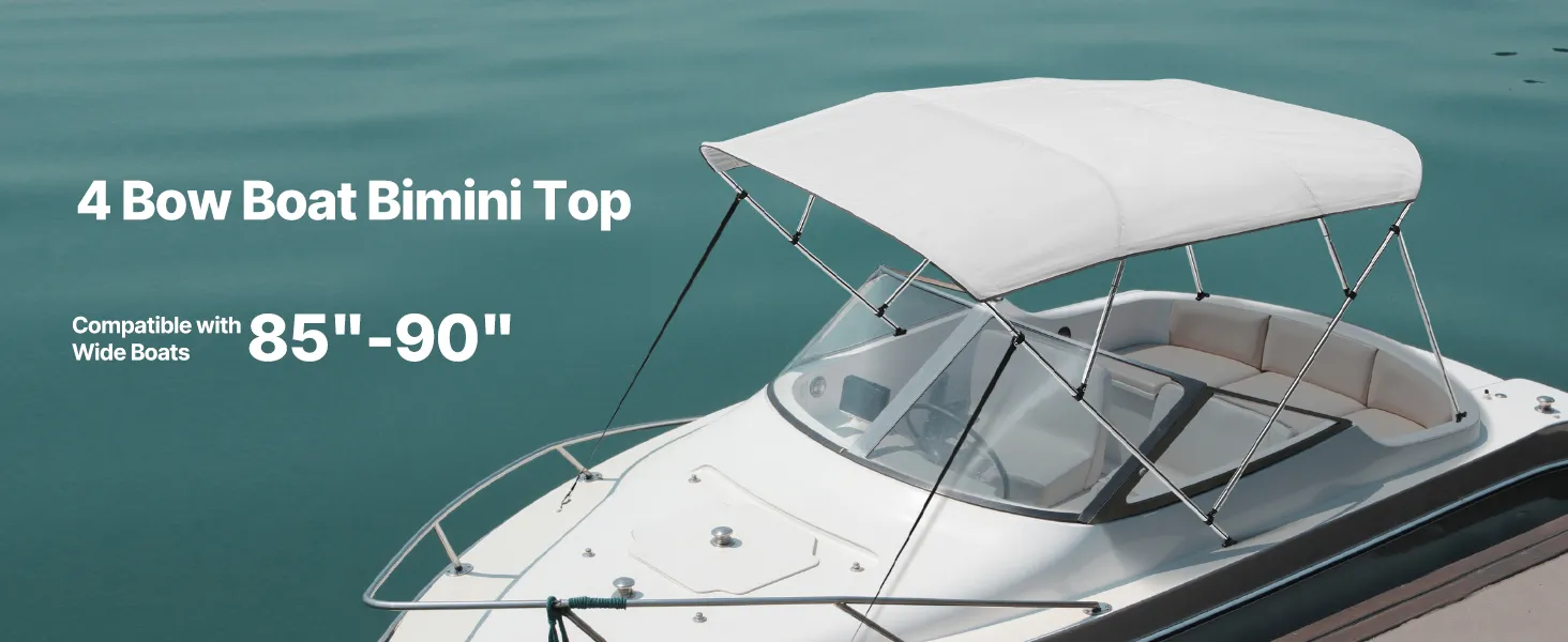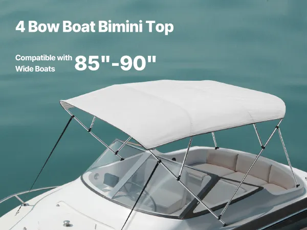 Wählen Sie Ihre ideale Größe: Erhältlich in verschiedenen Größen, einschließlich 4 Bögen (L x B x H) 96 x 85-90 x 54 Zoll (243,84 x 215,9-228,6 x 137,16 cm). Messen Sie einfach die Deckbreite Ihres Bootes und wählen Sie die passende Markise