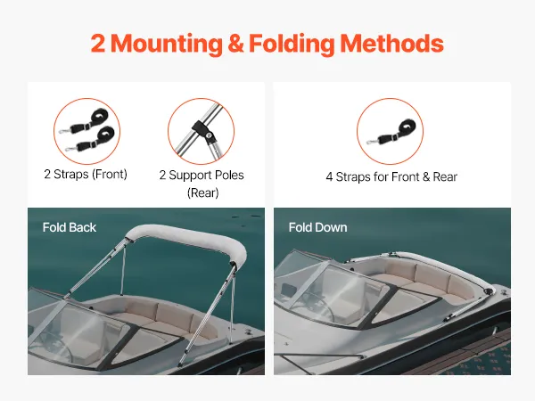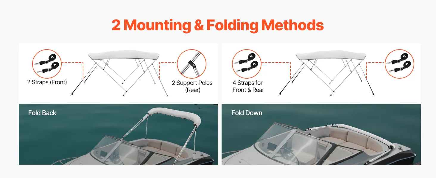 Wählen Sie aus zwei Montagemethoden, um die Markise auf Ihrem Boot zu befestigen. Sie können sie sowohl nach unten als auch nach hinten klappen. Die mitgelieferten Gurte mit Schnellverschlüssen machen den Aufbau schnell und einfach.