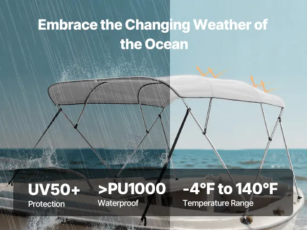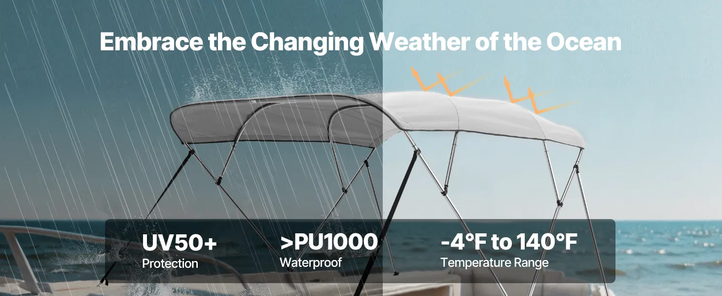 Robuster 600D-Sonnenschutzstoff: Diese Bootsmarkise ist aus strapazierfähigem 600D-Polyestergewebe in Marinequalität gefertigt und bietet hervorragenden UV-Schutz (Sonnenschutz) und Wasserbeständigkeit (über PU1000). Dank seiner hochdichten Webart und der doppelt genähten Nähte ist der Stoff so konzipiert, dass er länger hält, ohne zu verblassen oder zu reißen. Ideal, um Sie auf dem Wasser kühl und trocken zu halten