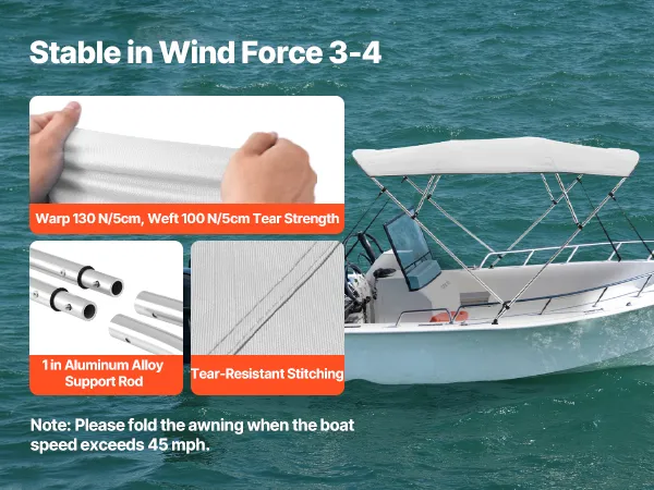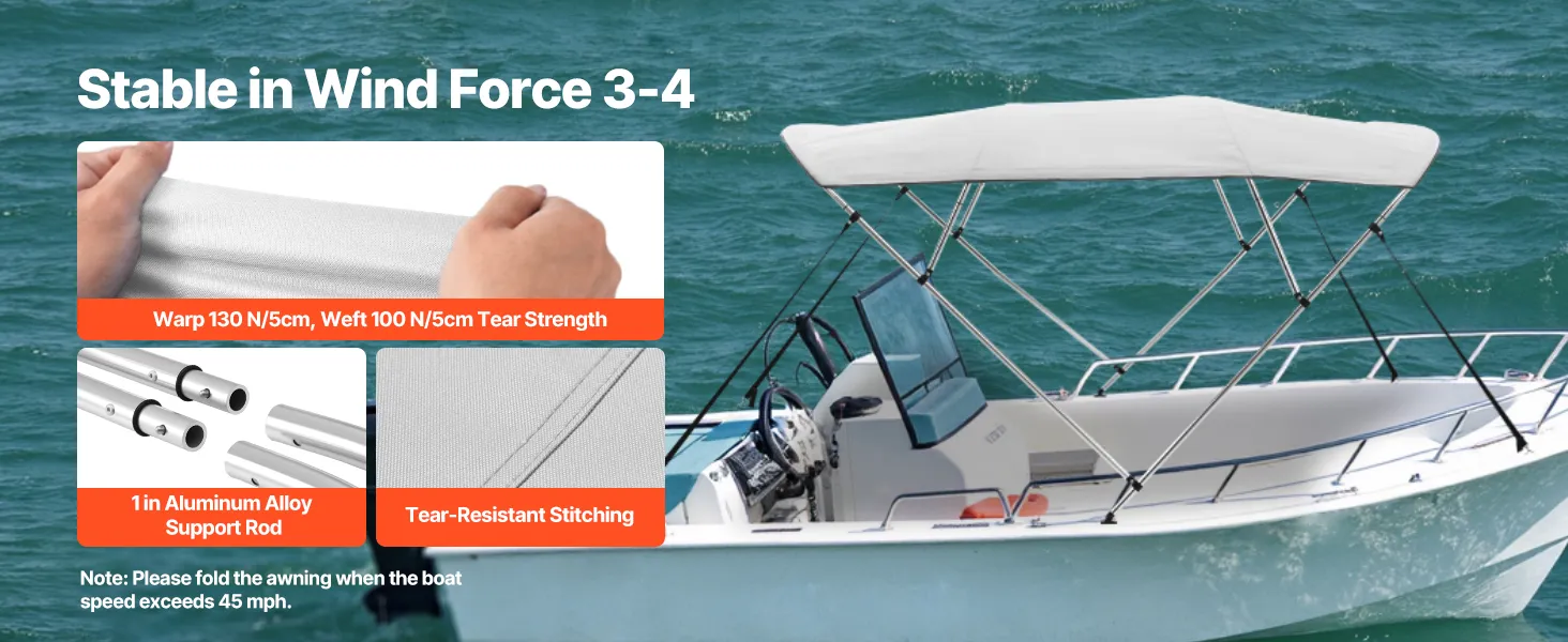 Windbeständig bis 72,42 km/h: Dieses Bimini Top für Boote ist für Windgeschwindigkeiten bis zu Stufe 3-4 ausgelegt und verfügt über stabile 1 Zoll (25,4 mm) dicke Aluminiumstangen und -verbinder für einen soliden Halt. Sie müssen sich keine Sorgen mehr machen, dass es bei starkem Wind umkippt oder schwankt. Tipp: Wenn Ihre Bootsgeschwindigkeit 45 mph (72,42 km/h) überschreitet, können Sie das Verdeck aus Sicherheitsgründen einfach zusammenfalten.