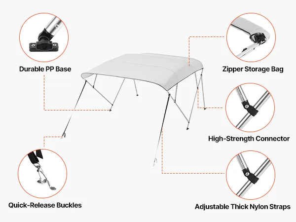 Dieses Bimini Top für Boote ist mit 25,4 mm dicken Stützstangen aus Aluminiumlegierung und einer robusten PP-Basis ausgestattet und lässt sich sicher an Ihrem Boot befestigen. Die rostbeständigen Materialien stellen sicher, dass es durch Seewasser oder Regen nicht korrodiert.