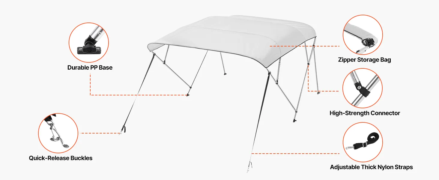 Diese Bootsmarkise aus 600D dickem, hochdichtem gefärbtem Polyestergewebe ist lichtbeständig und bietet Sonnenschutz. Bleiben Sie den ganzen Tag kühl und geschützt vor Sonne und Regen.