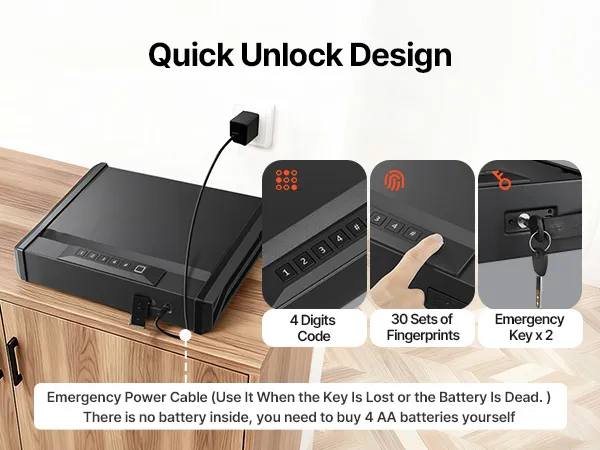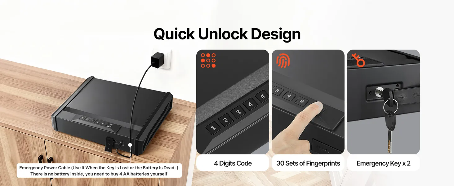 3 Zugriffsmethoden: Dieser Waffentresor bietet 3 Entsperroptionen – speichern Sie bis zu 30 Fingerabdrücke oder einen 4-stelligen Code, um unbefugten Zugriff zu verhindern. Enthält 2 Ersatzschlüssel und einen USB-Notfallanschluss für schnellen Zugriff, auch wenn die Batterien leer sind
