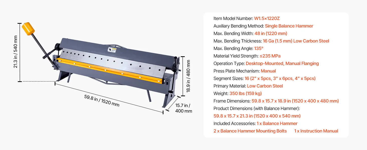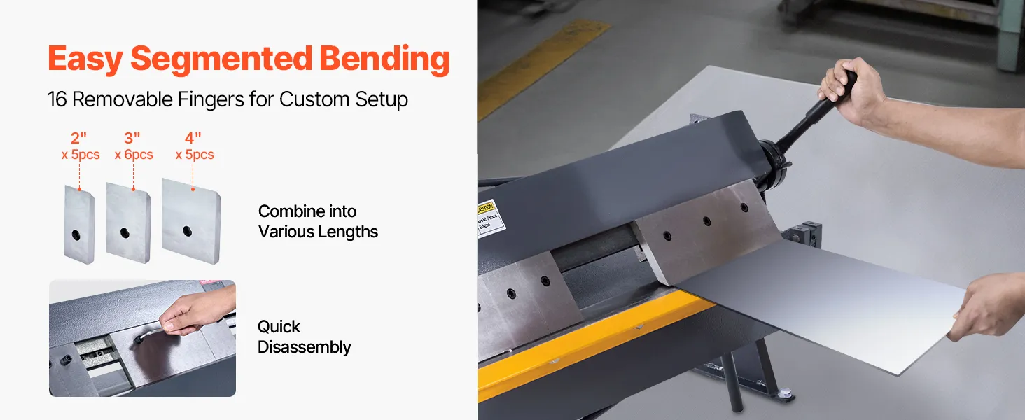 VEVOR Biegemaschine, 1220 mm Kantbank, 1,5-mm-Weichstahl-Biegedicke, 0–135 Grad einstellbar, Blechbieger, Schwenkbiegemaschine mit 16 Fingern, Blechbiegemaschine für präzises Biegen