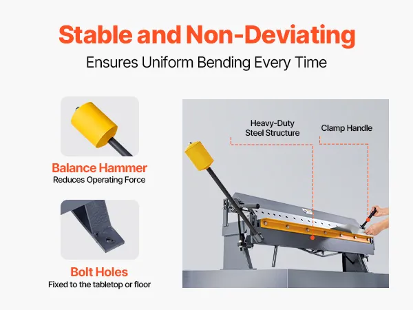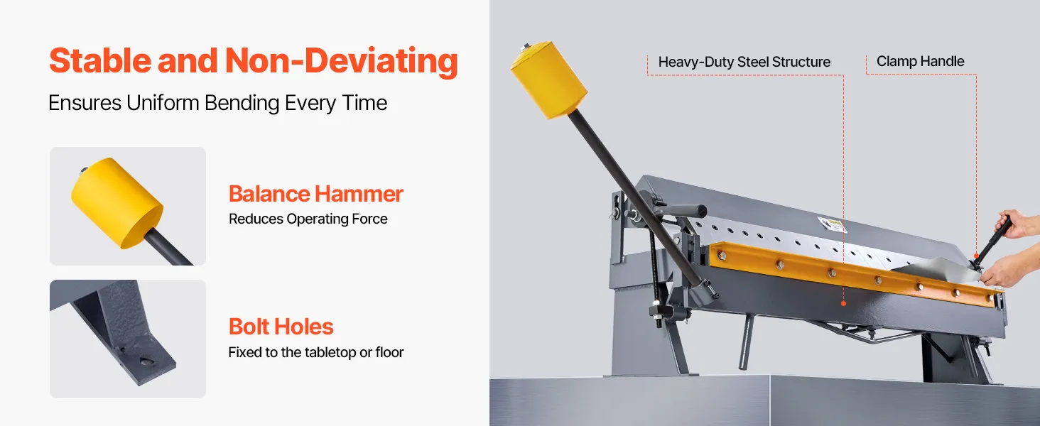 Müheloser und stabiler Betrieb: Die Metallbiegemaschine verfügt über einen einzelnen Ausgleichshammer für sicheres Klemmen, wodurch der zum Biegen erforderliche Kraftaufwand reduziert und die Arbeitseffizienz verbessert wird. Die vorgebohrten Löcher an der Basis ermöglichen eine einfache Montage auf einer Werkbank oder dem Boden.