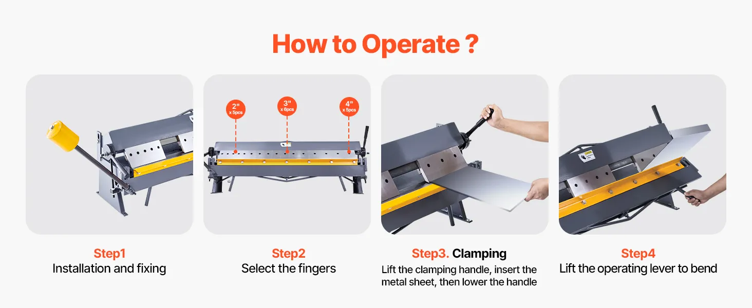 Einfache Bedienung: Die Bedienung des Aluminium-Biegegeräts ist kinderleicht. Heben Sie einfach den Klemmgriff an, legen Sie das Blech auf und senken Sie den Griff ab, um es zu fixieren. Heben Sie dann den Hebel langsam bis zum gewünschten Winkel an. Die Winkeleinstellung erfolgt manuell. Beachten Sie, dass beim Biegen von Metall immer eine Rückfederung auftritt (z. B. für eine 90°-Biegung den Winkel auf 92° einstellen).