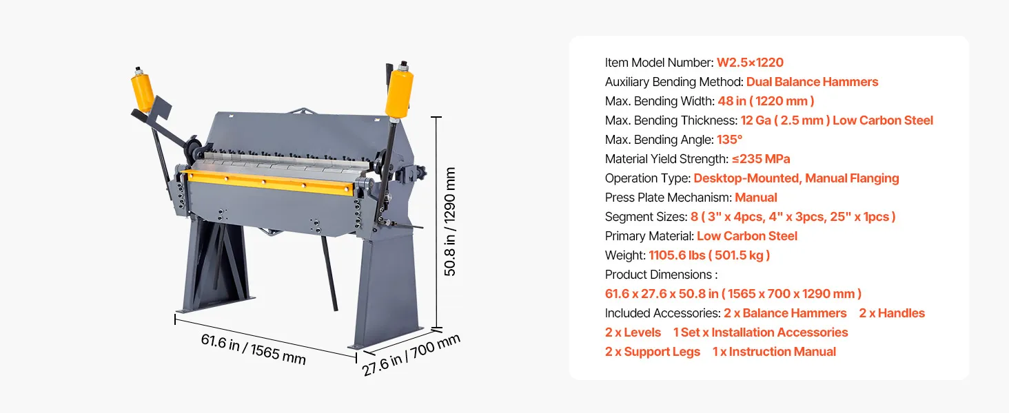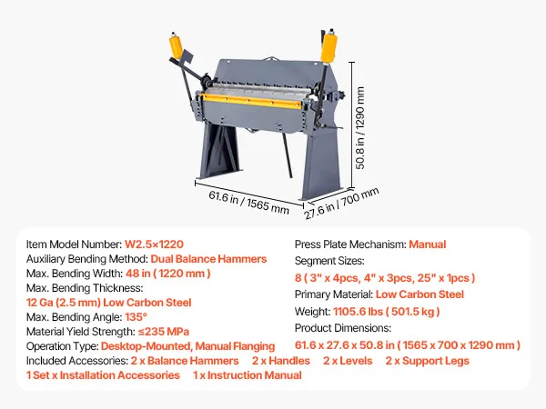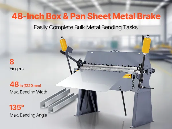 48-Zoll (1220 mm)-Schwerlastbiegemaschine: Diese Blechbiegemaschine verarbeitet Bleche mit einer Breite von bis zu 48 Zoll (1220 mm) und Biegewinkeln von 0° bis 135° und ist daher ideal für mittelgroße Fertigungswerkstätten und Projekte mit großem Blechdurchmesser.