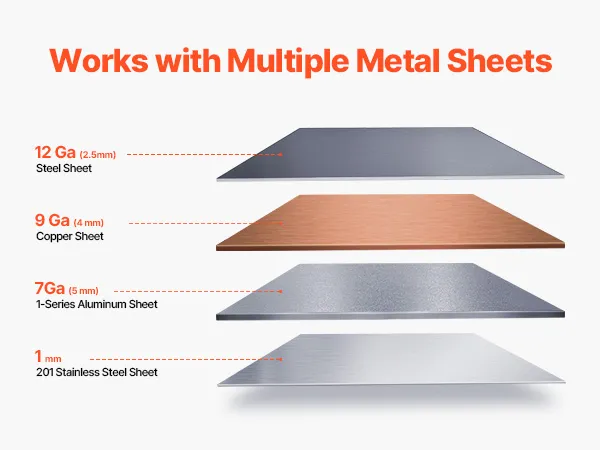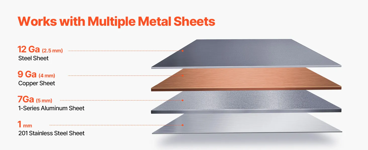 Vielseitige Materialkompatibilität: Unsere Schwenkbiegemaschine ist mit Weichstahl, Edelstahl, Kupfer und Aluminium kompatibel. Sie kann Weichstahl der Stärke 12 (2,5 mm) biegen – für anspruchsvolle Aufgaben.