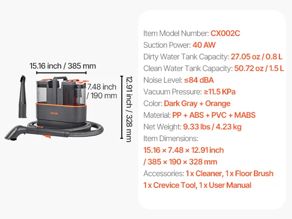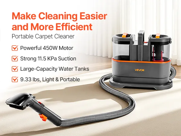 Der tragbare Teppichreiniger vereint leistungsstarke Reinigung mit benutzerfreundlichem Design. Sein 450-Watt-Motor erzeugt eine Saugleistung von 11,5 kPa für die Reinigung des gesamten Hauses. Enthält zwei Spezialbürsten: eine Teppichbürste und eine Fugendüse. Mit nur 3,85 kg Gewicht ist er leicht zu bewegen. Teppichreinigung in nur drei Schritten – einfach und effizient.