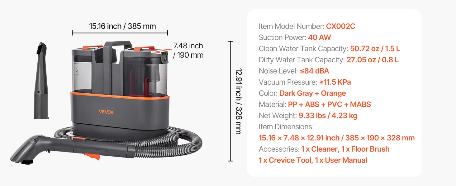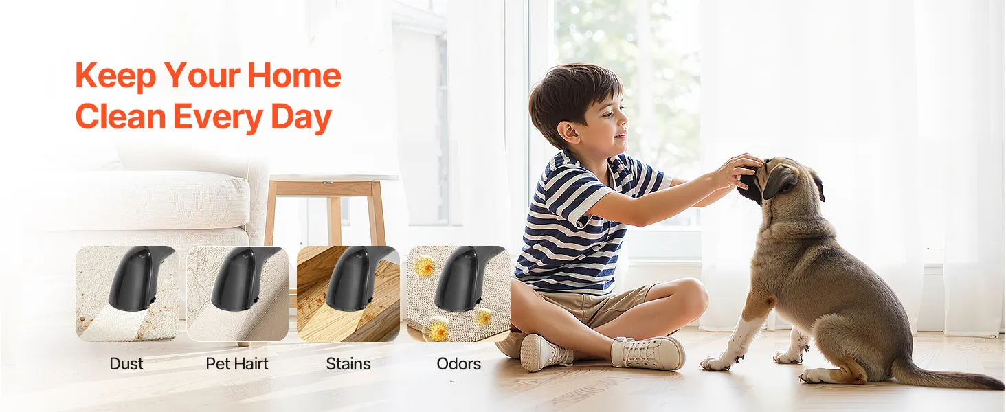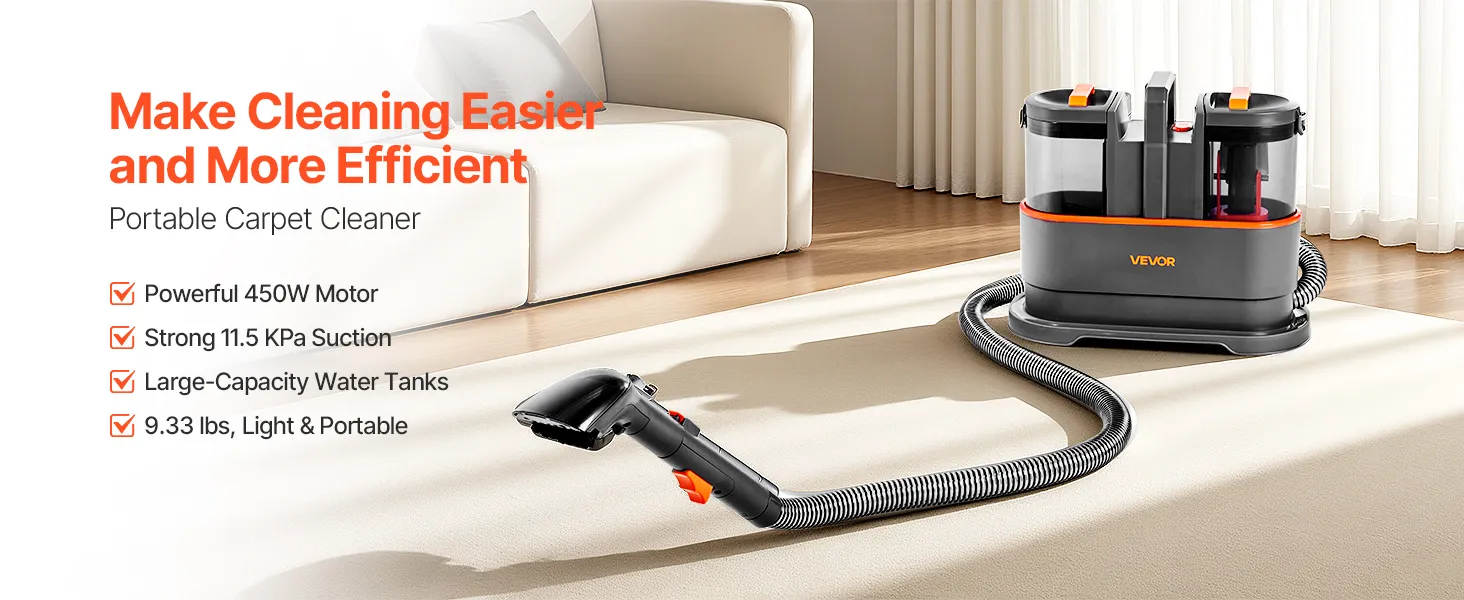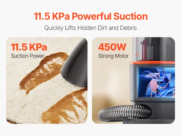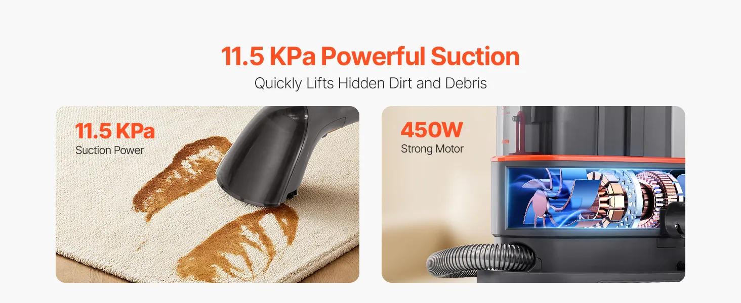 Starke Saugkraft: Unser Teppichreiniger liefert eine Saugkraft von 11,5 KPa über einen 450-W-Motor und entfernt tiefsitzende Flecken aus Teppichen/Sofas/Autoinnenräumen; fängt sofort Tierhaare, Essensreste und alltäglichen Staub ein und sorgt so für stets saubere Räume