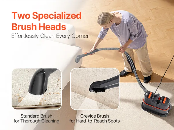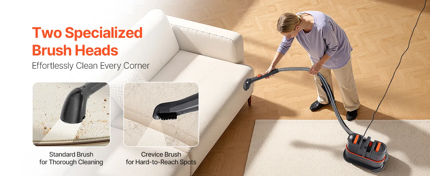 Unser Teppichreiniger verfügt über zwei Spezialbürsten: Eine Bürste mit harten Borsten beseitigt oberflächlichen Schmutz, während ein schmales Fugendüsenwerkzeug enge Stellen wie Fußleisten und Möbelzwischenräume erreicht.