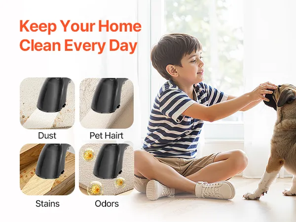 Ideal für Haushalte mit Haustieren oder Kindern. Nimmt Tierhaare, Hautschuppen und Gerüche auf und reinigt gleichzeitig Teppiche und Polster gründlich – für die Gesundheit Ihrer Familie in einem frischen, aufgeräumten Raum.