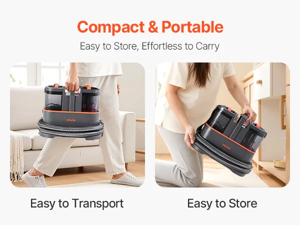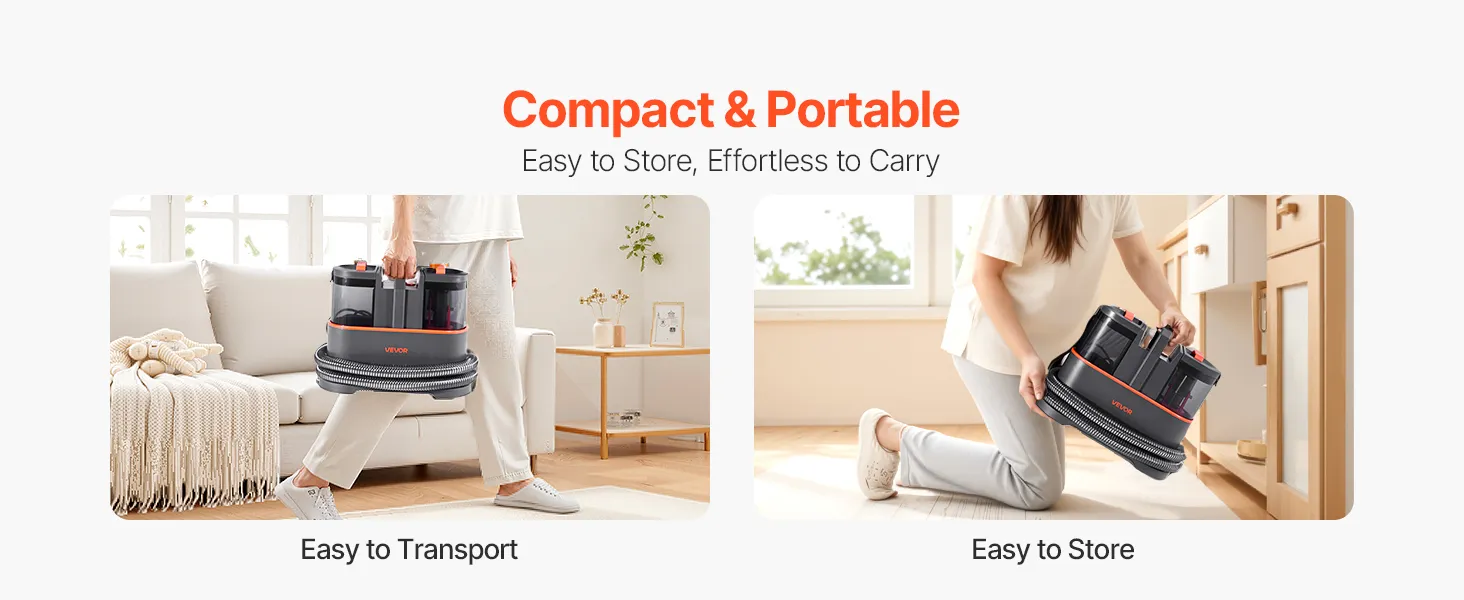 Unser tragbarer Teppichreiniger ist platzsparend und lässt sich problemlos in Ecken verstauen oder mitnehmen. Sparen Sie sich das Heben schwerer Lasten – reinigen Sie überall, ohne Ihren Arbeitsablauf zu unterbrechen.