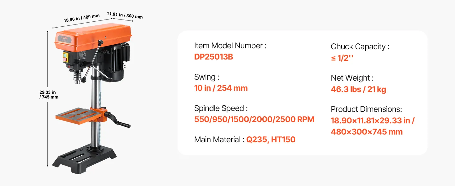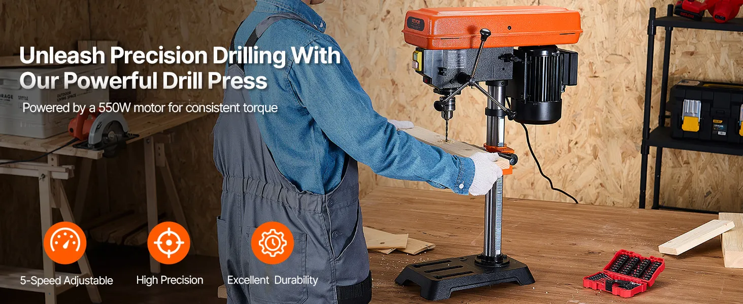 VEVOR 254 mm Tischbohrmaschine, 550 W Induktionsmotor, Säulenbohrmaschine mit 550-2500U/min einstellbarer Geschwindigkeit, 0–45° neigbarer Arbeitstisch, Röntgenpositionierung, für Holzmetall