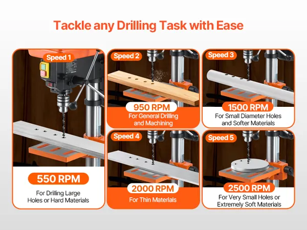 Wechseln Sie zwischen 5 Geschwindigkeitseinstellungen, indem Sie die Riemenposition anpassen und die Geschwindigkeit der Tischbohrmaschine an verschiedene Materialien und Werkstückgrößen anpassen, um optimale Effizienz und Präzision zu erzielen.