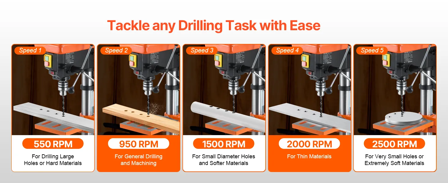 Variable 5-Gang-Steuerung: Passen Sie Ihr Bohrerlebnis mit fünf einstellbaren Geschwindigkeiten von 550 bis 2500 U/min an. Wechseln Sie mühelos zwischen den Geschwindigkeiten, indem Sie den Riemen verstellen. Mit unserer Standbohrmaschine können Sie eine Vielzahl von Materialien und Projekten präzise bearbeiten.
