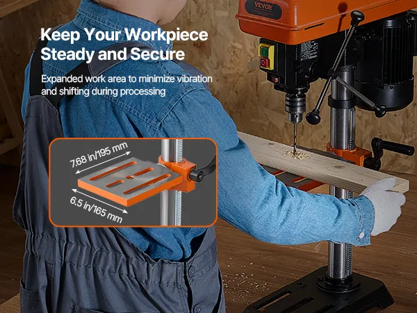 Der aus dickem Metall gefertigte Arbeitstisch bietet außergewöhnliche Stabilität. Er ist außerdem höhenverstellbar und kann sowohl horizontal als auch vertikal um 45° geneigt werden – ideal für die präzise Positionierung bei komplexen Bohrarbeiten.