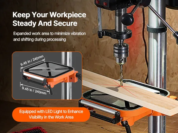 Verstellbarer Arbeitstisch: Der verdickte Metallarbeitstisch trägt eine 150 mm lange Verlängerung und bietet Höhen- und 45°-Winkelverstellungen. Genießen Sie die Flexibilität und Stabilität, die Sie für komplexe Bohrarbeiten benötigen, und machen Sie diese Bohrmaschine zu einem unverzichtbaren Werkzeug für jeden Heimwerker.