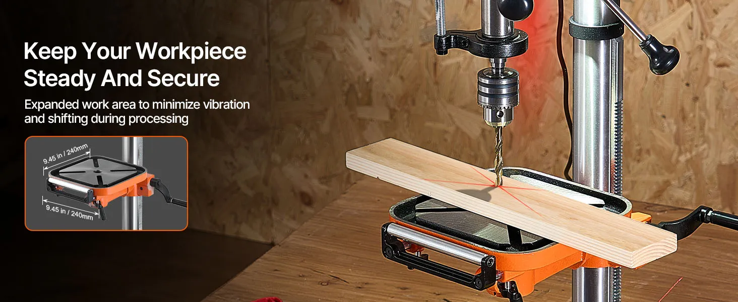Der Arbeitstisch besteht aus verdicktem Metall für hervorragende Stabilität und unterstützt Höhen- und 45°-Winkeleinstellungen, wodurch eine präzise Positionierung und Durchführung komplexer Bohraufgaben ermöglicht wird.