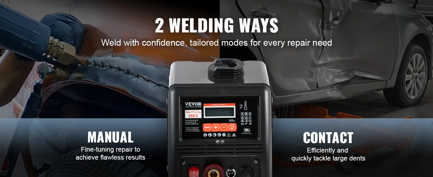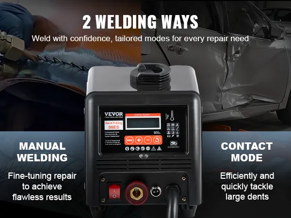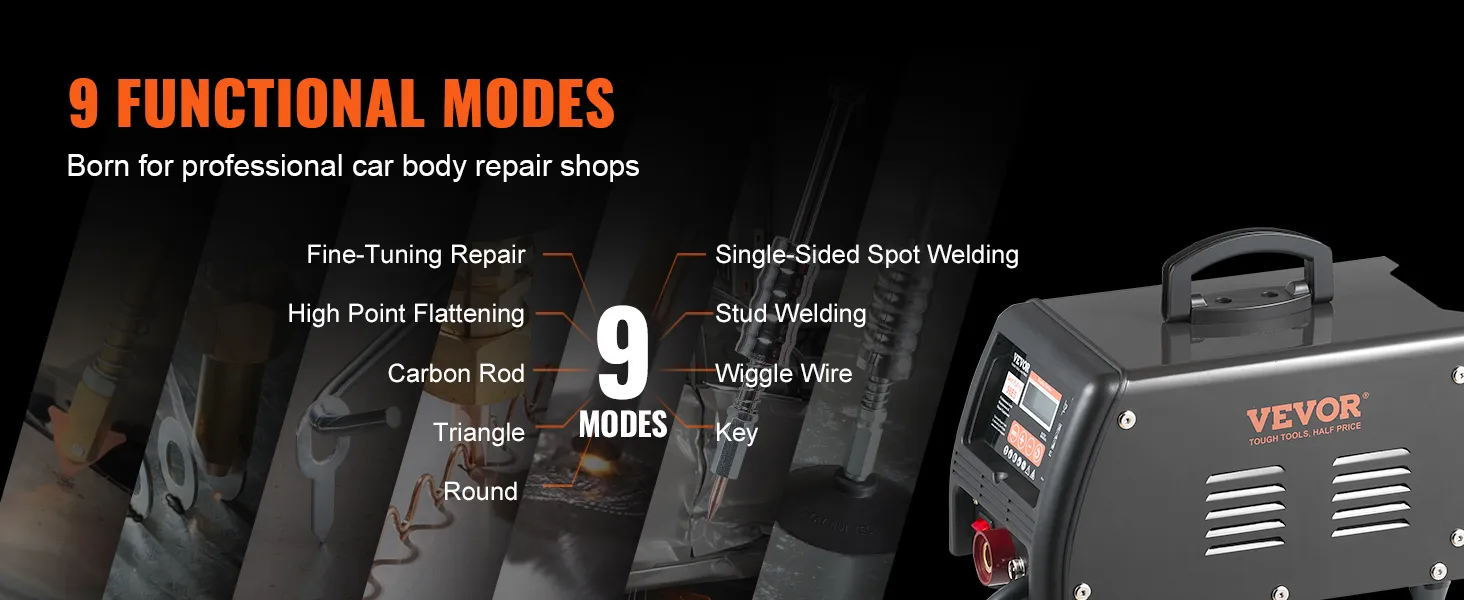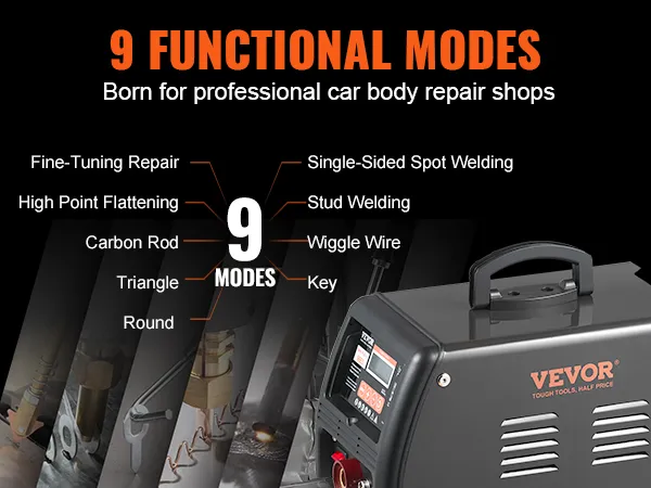 Der Dellenzieher-Schweißer von VEVOR verfügt über 9 Modi, darunter Feinabstimmungsreparatur, Abflachung hoher Punkte, Kohlenstoffstab, Dreieck, Rund, OT, Wellendraht, einseitiges Punktschweißen und Bolzenschweißen.
