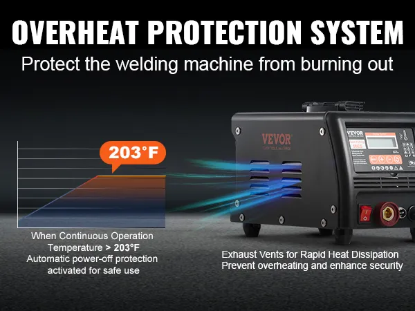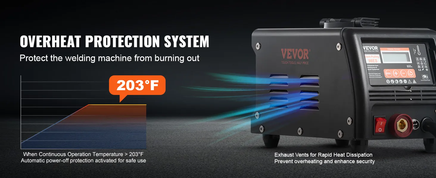 Unser Punktschweißgerät ist mit einem intelligenten Überhitzungsschutzsystem ausgestattet, das aktiviert wird, wenn die Temperatur 203 °F überschreitet, und so Kurzschlüsse und Maschinenschäden verhindert.