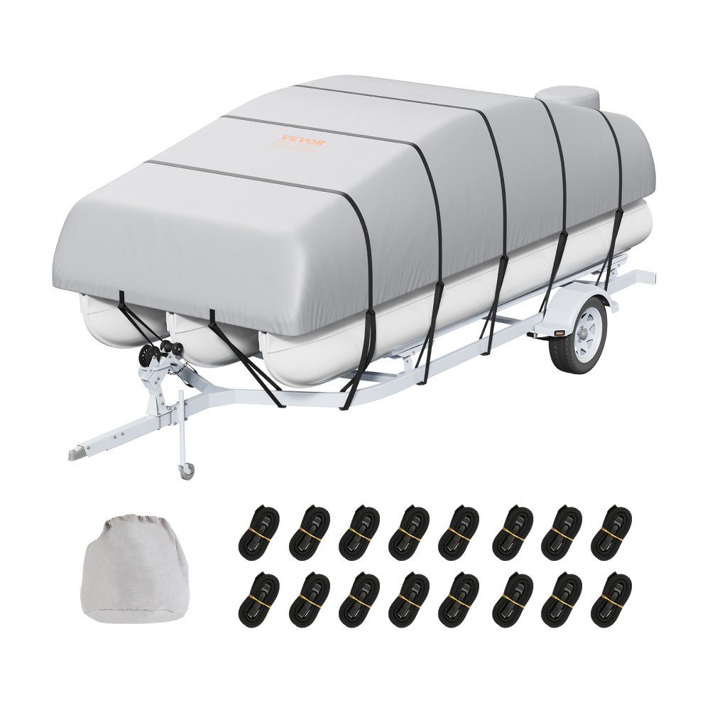 Hurricane-proof safety: The adjustable straps of our waterproof pontoon boat cover ensure a secure fit. A sturdy elastic hem on the inside of the cover's edge creates a tight seal, compensates for slight size variations, and ensures a snug fit against the hull. These features provide reliable protection for your boat, even in harsh weather conditions such as storms or blizzards.