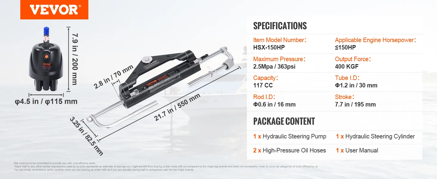 150 HP Hydraulic Steering Kit: Our 150 HP hydraulic boat steering system includes a hydraulic steering cylinder, a low-friction hydraulic pump, two 20-foot high-pressure hoses, and a complete accessory kit. It's the perfect replacement for outdated or damaged hydraulic steering systems. Enjoy unparalleled control and stability on your boating trips!