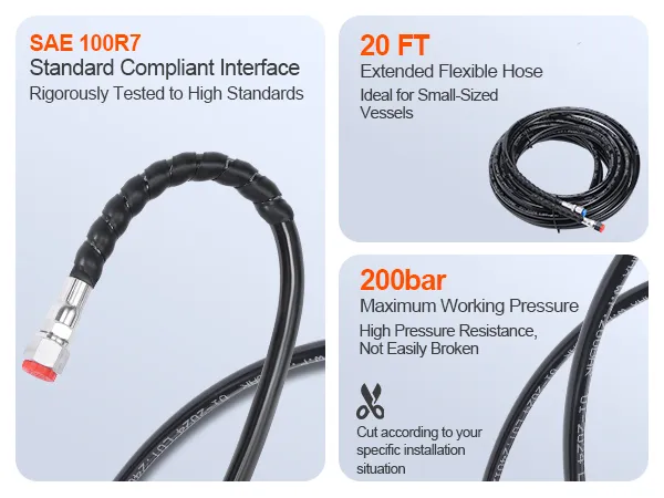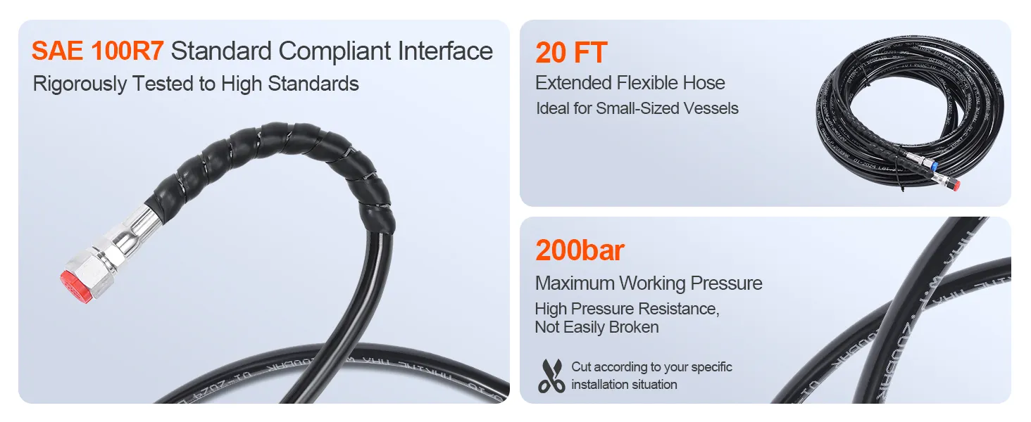 2 x 20ft Hydraulic Hoses: With a maximum operating pressure of 200 bar and reinforced with thick nylon tubing, our hydraulic hoses are engineered to withstand heavy loads without bursting or leaking. This ensures a fast and reliable response to every steering maneuver. Equipped with 5/16" quick-connect fittings, these hoses offer effortless installation flexibility for various vessel types. Master the water with precision and ease.