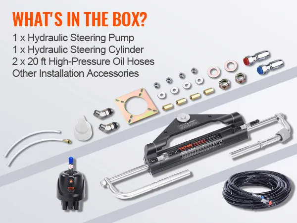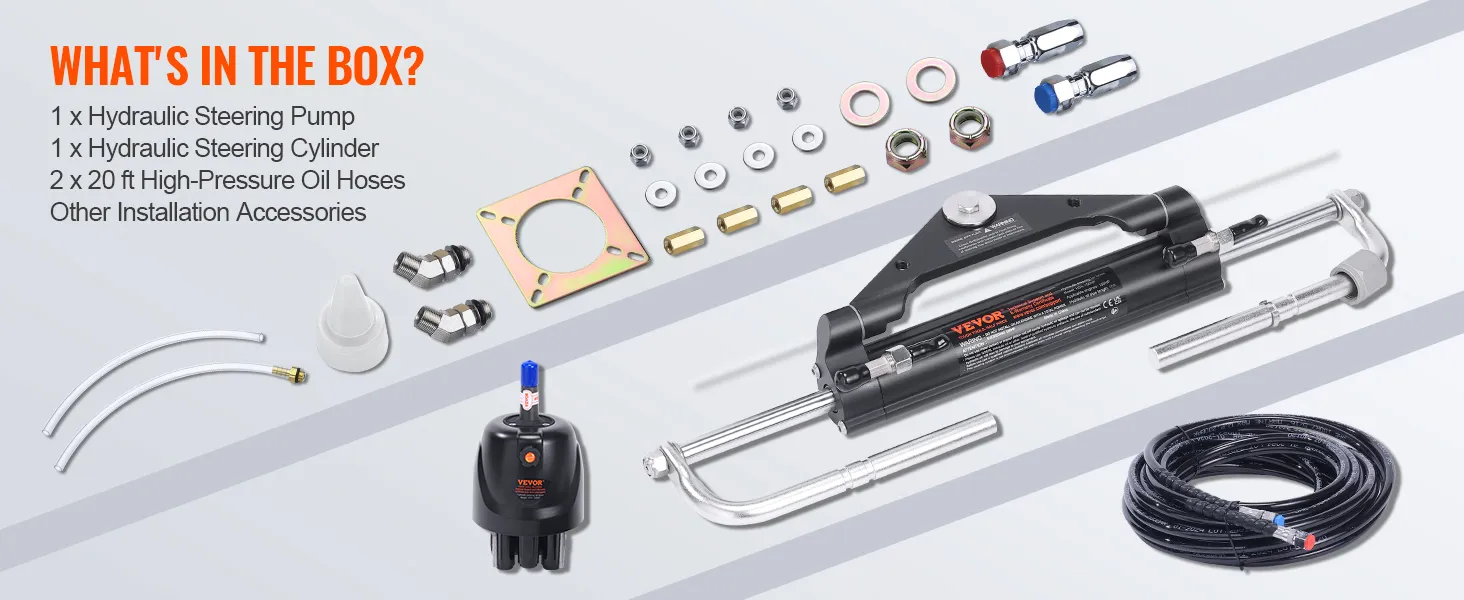 Our marine hydraulic steering kit provides everything you need for smooth setup and maintenance. It includes a hydraulic steering cylinder, a hydraulic pump, two 20-foot hydraulic hoses, and a comprehensive accessory kit to meet all your installation requirements.