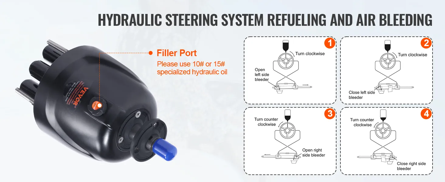 Before using our outboard hydraulic steering kit, you must fill it with oil and bleed any air. If performance decreases or response is delayed, check the hydraulic fluid level and bleed the system. We strongly recommend reading and following the user manual.