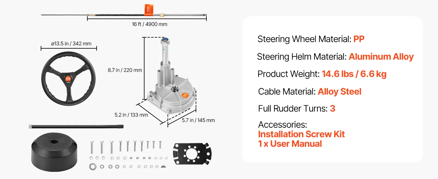Es ist eine großartige Ergänzung zu diesem Lenksystem. Sie können es für viele verschiedene Bootstypen verwenden, darunter Yachten und Fischerboote. Egal, ob Sie weniger als 4–5 kleine oder große Boote haben, es funktioniert gut. Das System ist für verschiedene Anforderungen konzipiert. Es gewährleistet eine reibungslose und komfortable Lenkung verschiedener Schiffe. Dies macht es sowohl für private als auch für gewerbliche Boote zuverlässig. Die breite Anwendung des Systems rechtfertigt ein Upgrade. Sie können eine nahtlose Lenkung über mehrere Bootsmodelle hinweg genießen. VEVOR bietet eine Komplettlösung für die Bootslenkung.