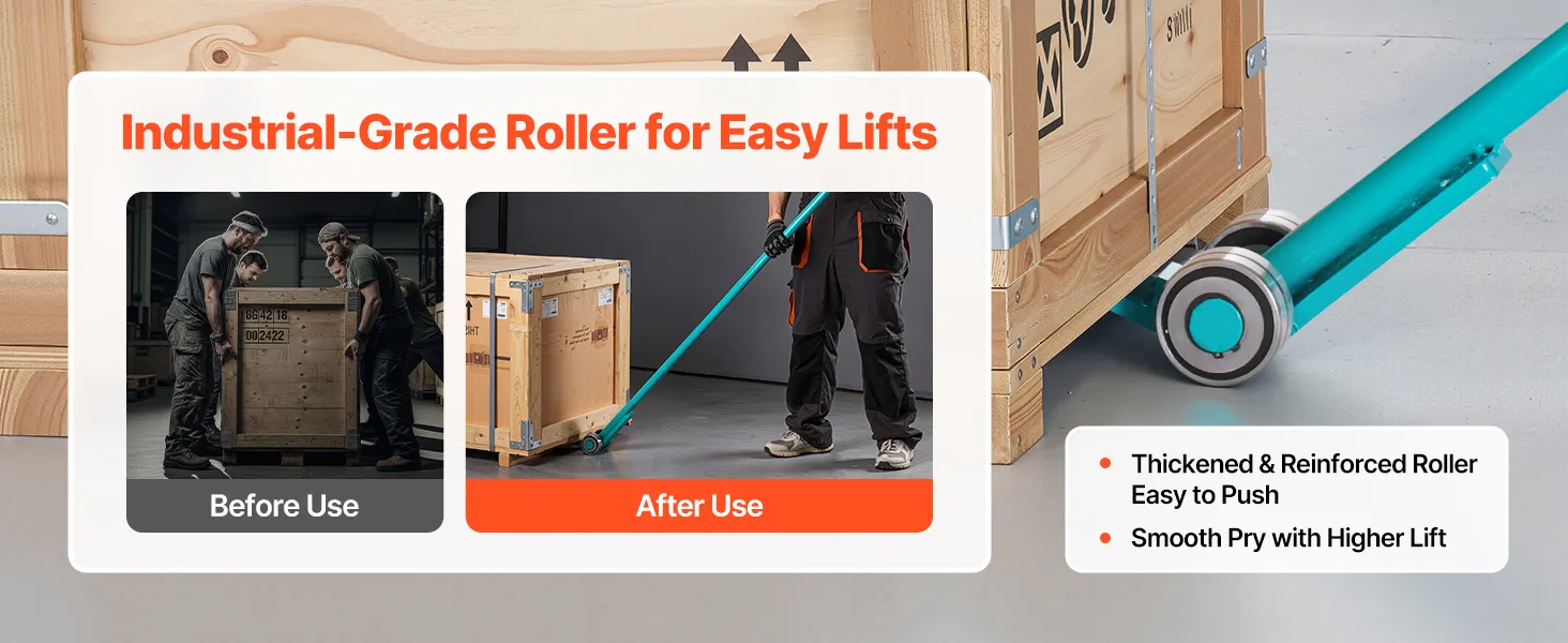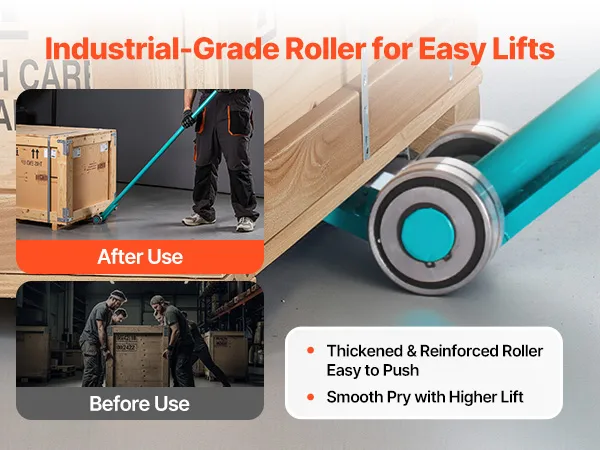 Die verbreiterte Grundplatte erhöht Auflagefläche und Stabilität für müheloses Heben. Wärmebehandelter 45#-Kohlenstoffstahl garantiert Robustheit und Verschleißfestigkeit. Die leise Kohlenstoffstahlrolle reduziert Reibung, und der lange, ergonomische Griff minimiert Bücken und spart Kraft.