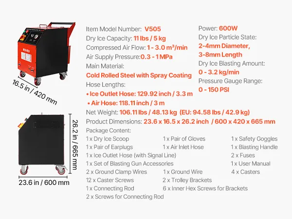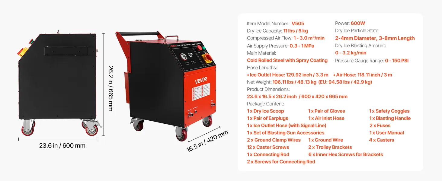 Erfordert einen externen Luftkompressor mit einem Außendurchmesser > DN20 und einem Nenndruck > 6 bar. Trockeneiskapazität: 5 kg (11 lb), Druckluftdurchflussrate: 1 bis 3,0 m³/min, Trockeneispartikelzusammensetzung: Durchmesser 2 bis 4 mm, Länge 3 bis 8 mm, Luftversorgungsdruck: 0,3 bis 1 MPa, Trockeneisstrahlmenge: 0 bis 3,2 kg/min.