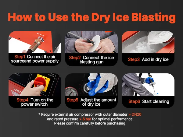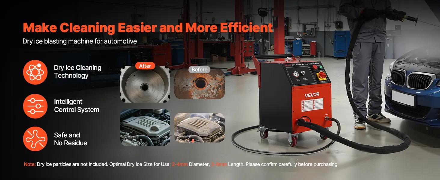 Hocheffiziente Trockeneismaschine: Diese leistungsstarke Trockeneisstrahlmaschine nutzt fortschrittliche Technologie und beschleunigt Partikel mit Hochdruckluft, um Kohlenstoffablagerungen zu entfernen. Reinigt ohne Demontage