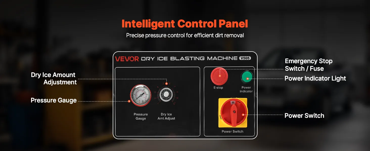 Dieses Trockeneisstrahlgerät ist mit einem intelligenten Bedienfeld ausgestattet, das die Reinigung verschiedener Oberflächen erleichtert. Es enthält keine schädlichen Substanzen, Chemikalien oder Reagenzien und gewährleistet so eine sichere und schnelle Entfernung von Rückständen. (Hinweis: Trockeneispartikel sind nicht im Lieferumfang enthalten.)