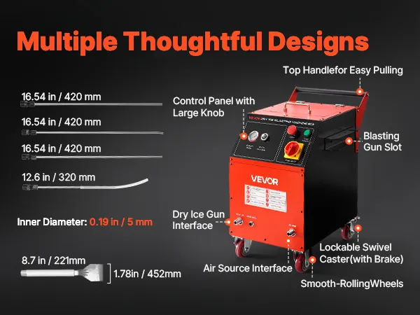 Intelligente Steuerung und Mobilität: Unser Trockeneisstrahlgerät verfügt über ein intuitives Bedienfeld. Es ist mit 4 vielseitigen Düsen für unterschiedliche Aufgaben und 4 leichtgängigen Rädern für optimale Manövrierfähigkeit ausgestattet.