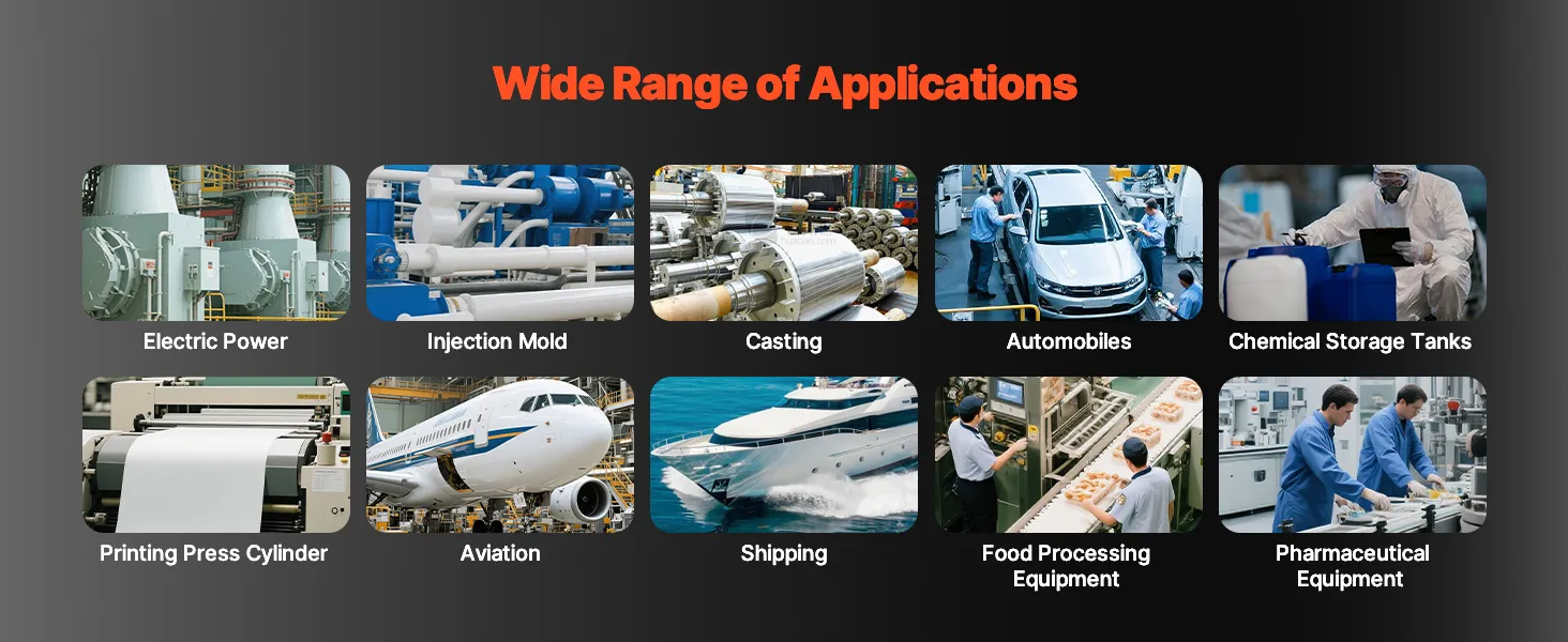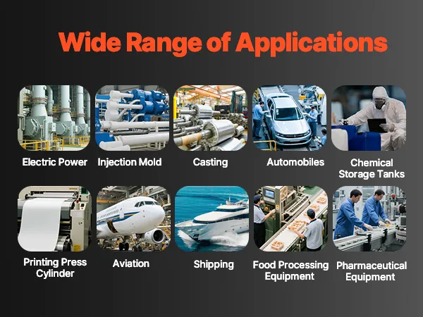 Weit verbreitet in der Stromerzeugung, im Spritzguss, in der Gussindustrie, in der Automobilindustrie, bei Druckmaschinenzylindern, in Chemikalienlagertanks, in der Luftfahrt, im Seetransport sowie in der Lebensmittelverarbeitung und pharmazeutischen Ausrüstung.