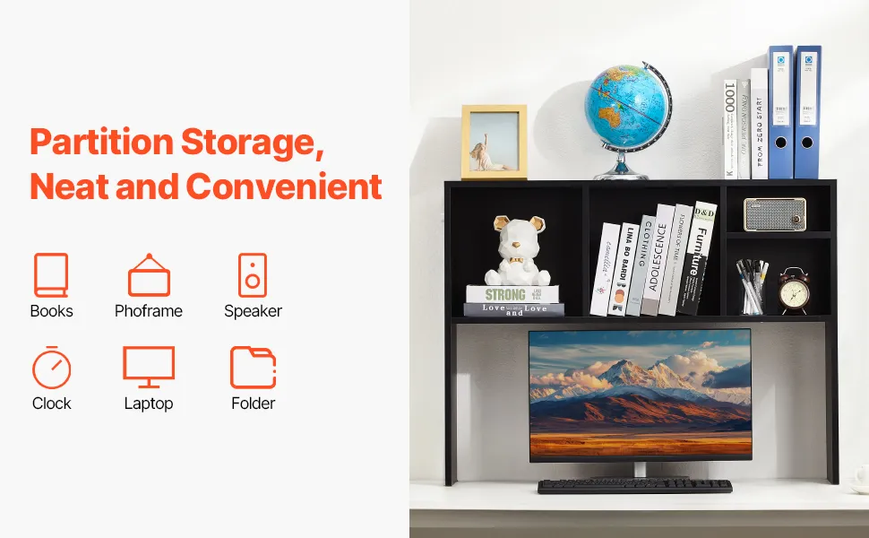 Ausgestattet mit mehreren Fächern zum Ordnen von Büchern, Büromaterial und mehr trägt dieser Schreibtischaufsatz dazu bei, einen aufgeräumten Arbeitsplatz zu schaffen und die Produktivität zu steigern.