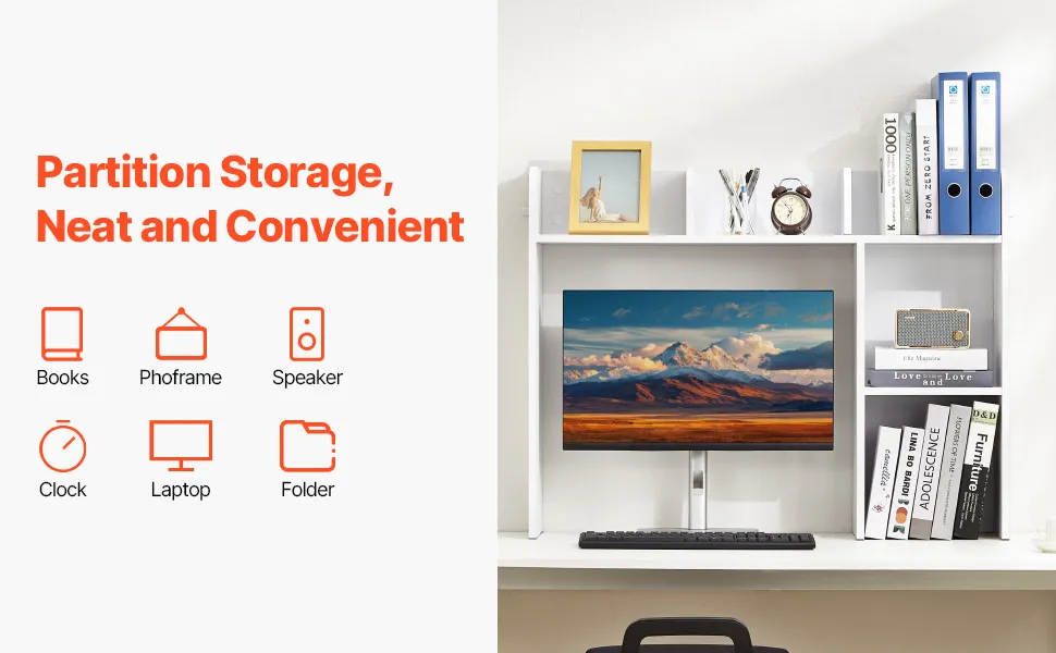 Ausgestattet mit mehreren Fächern zum Ordnen von Büchern, Büromaterial und mehr trägt dieser Schreibtischaufsatz dazu bei, einen aufgeräumten Arbeitsplatz zu schaffen und die Produktivität zu steigern.