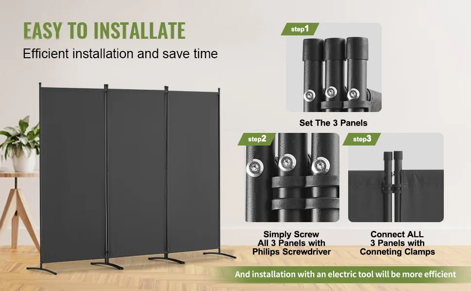Perfekt für jeden Raum: Das Raumteilerpaneel kann in verschiedenen Umgebungen wie Schlafzimmern, Wohnzimmern, Büros und Krankenhäusern verwendet werden, um private Trennräume zu schaffen. HINWEIS: Wenn Sie möchten, dass die Raumteiler stabiler sind, befestigen Sie die Beine der Raumteiler bitte mit einer Schraube J. Die Installation mit einem Elektrowerkzeug ist effizienter.