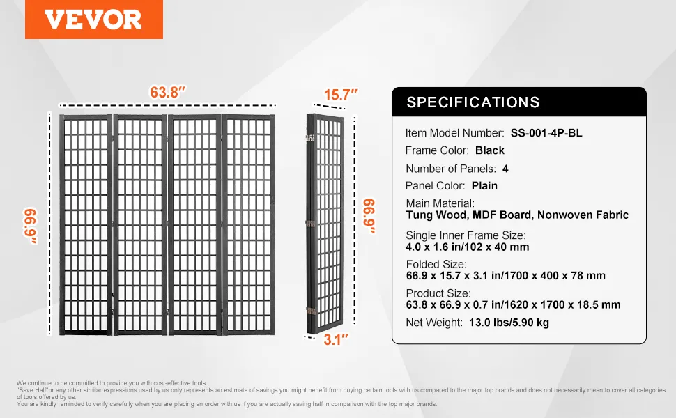VEVOR 4-teiliger japanischer Raumteiler faltbarer Sichtschutz aus Holz für den Innenbereich, japanische Trennwände tragbare Dekorationsschirme zur Raumtrennung für Restaurant & Schlafzimmer