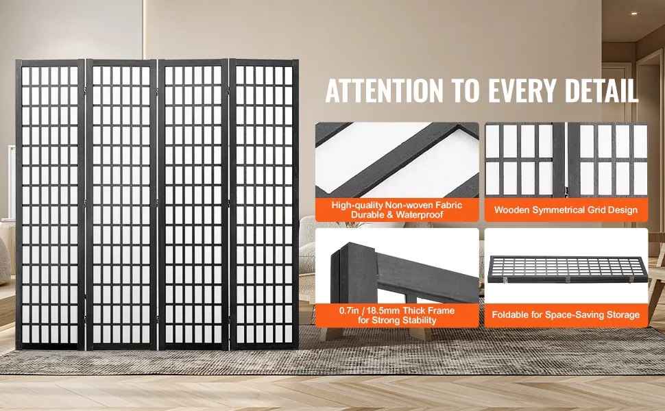 Japanischer Minimalismus: Der VEVOR-Raumteiler wertet Ihren Raum auf, und dieser 63,8-Zoll-Bildschirm (162 cm) im japanischen Stil ist mit drei eleganten Paneelen ausgestattet, die viel Privatsphäre bieten. Sein schlankes, symmetrisches Holzgitter ist die ideale Mischung aus Funktionalität und Stil und verleiht Ihrem Zuhause einen Hauch klassischen japanischen Charmes, während Sie bequem wohnen können.