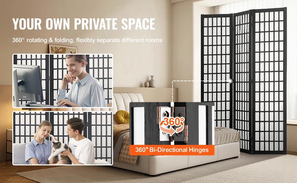 360° Drehen & Falten: Jedes Raumteilerpaneel ist mit drei flexiblen bidirektionalen Scharnieren verbunden, sodass Sie es um 360° drehen und in jede Richtung falten können. Dieses Design sorgt für Stabilität während der Verwendung. Wenn Sie diesen Raumteiler nicht verwenden, falten Sie ihn einfach zusammen und verstauen Sie ihn in einer Ecke – kein Durcheinander, nur Bequemlichkeit. Stellen Sie ihn im Zickzack auf, um zusätzlichen Halt zu bieten und ein Umkippen zu vermeiden.