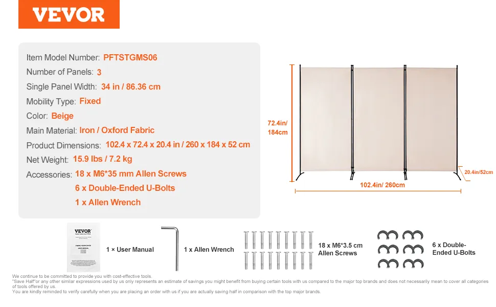 Einfach zu verstauen: Der Sichtschutz misst (102,4 x 72,4 x 20,4 Zoll / 2600 x 1840 x 520 mm), jedes Paneel misst 34 x 72,4 Zoll (863,6 x 1840 mm). Er ist faltbar, Sie können ihn problemlos überall hin mitnehmen.