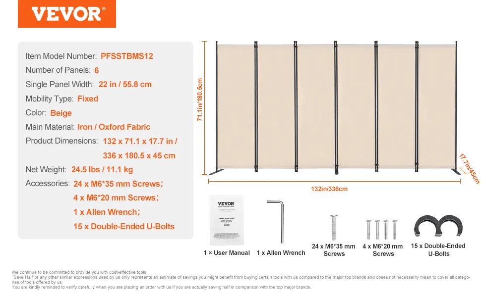 VEVOR Raumteiler 6 Paneele Paravent 3110 x 1805 x 450 mm, faltbarer Sichtschutz & tragbarer Trennwandteiler zur Raumtrennung, freistehende Raumteiler für Büro Schlafzimmer Arbeitszimmer, Beige