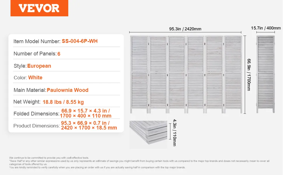 VEVOR stilvoller Raumteiler aus Holz mit 6 Paneelen