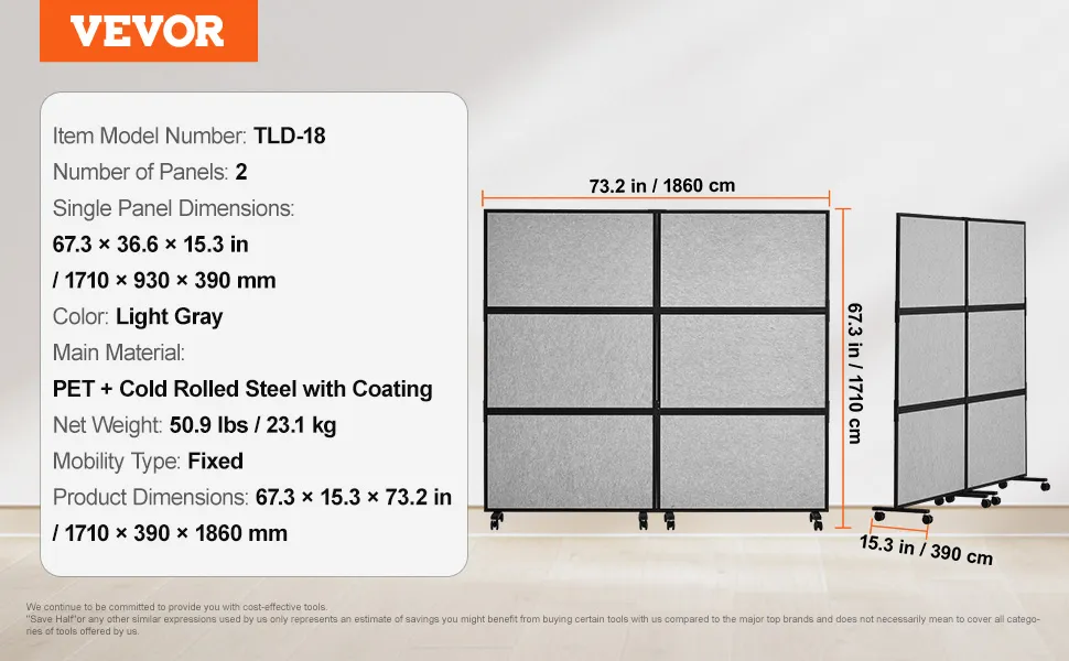 VEVOR Raumteiler Trennwand Paravent Schallschutzwand Doppelpanel, tragbare Bürotrennwand mit Polyester und Stahlkabinenwand, Raumtrenner (171 x 39 x 186 cm), Grau
