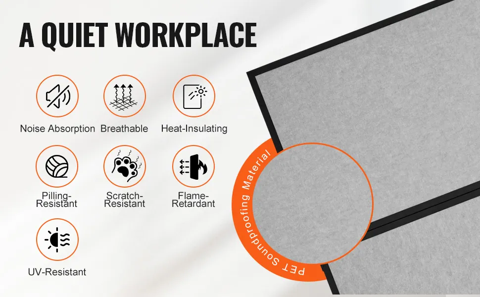 Schalldämmendes PET-Material: Unser Trennwandgewebe wurde auf schalldämmendes PET-Material aufgerüstet, das 85 % der Umgebungsgeräusche absorbiert. In Kombination mit einer weichen Polsterung verbessert es die Privatsphäre, Wärmedämmung, Atmungsaktivität und Lichtblockierung erheblich und schafft so eine ruhige Arbeitsumgebung.